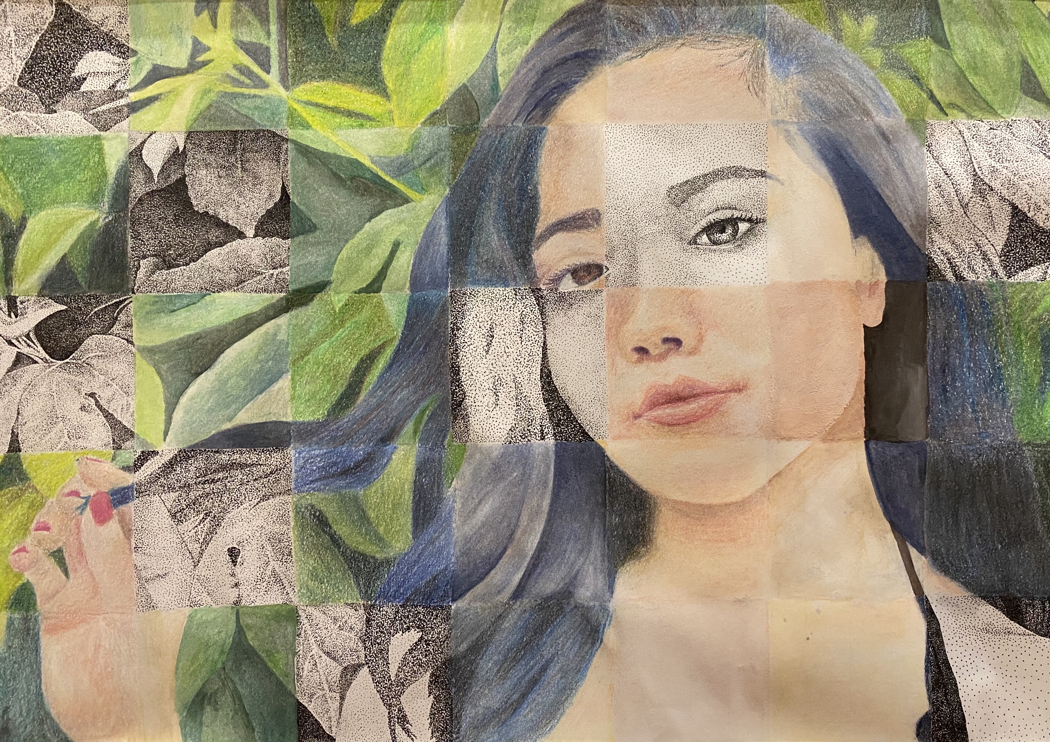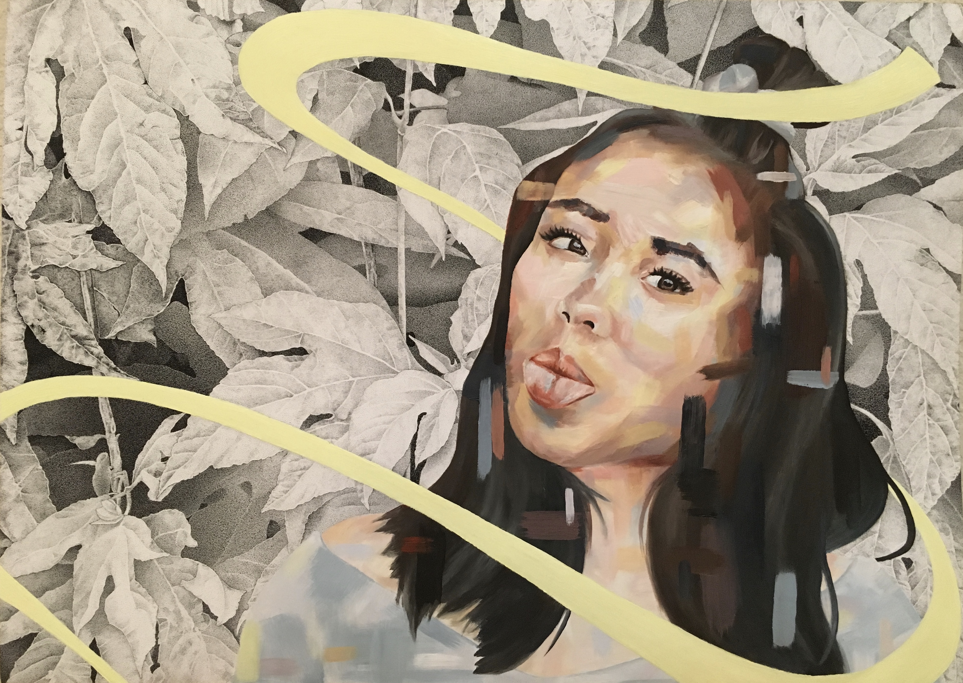 Inspired by Nicholas Baker and Davide Cambria, I created this piece practicing stippling and broad, separated brushstrokes. In the past year that this piece was created, I found myself to be in a happier state of mind and desired to represent that. The theme of the work is acceptance and contentedness. The wall of leaves in the background, created in grayscale, is meant to have a calming effect for the viewer, while the yellow ribbon around the figure represents a positive state of mind. Bright colors were used in the subject to create an uplifting tone.