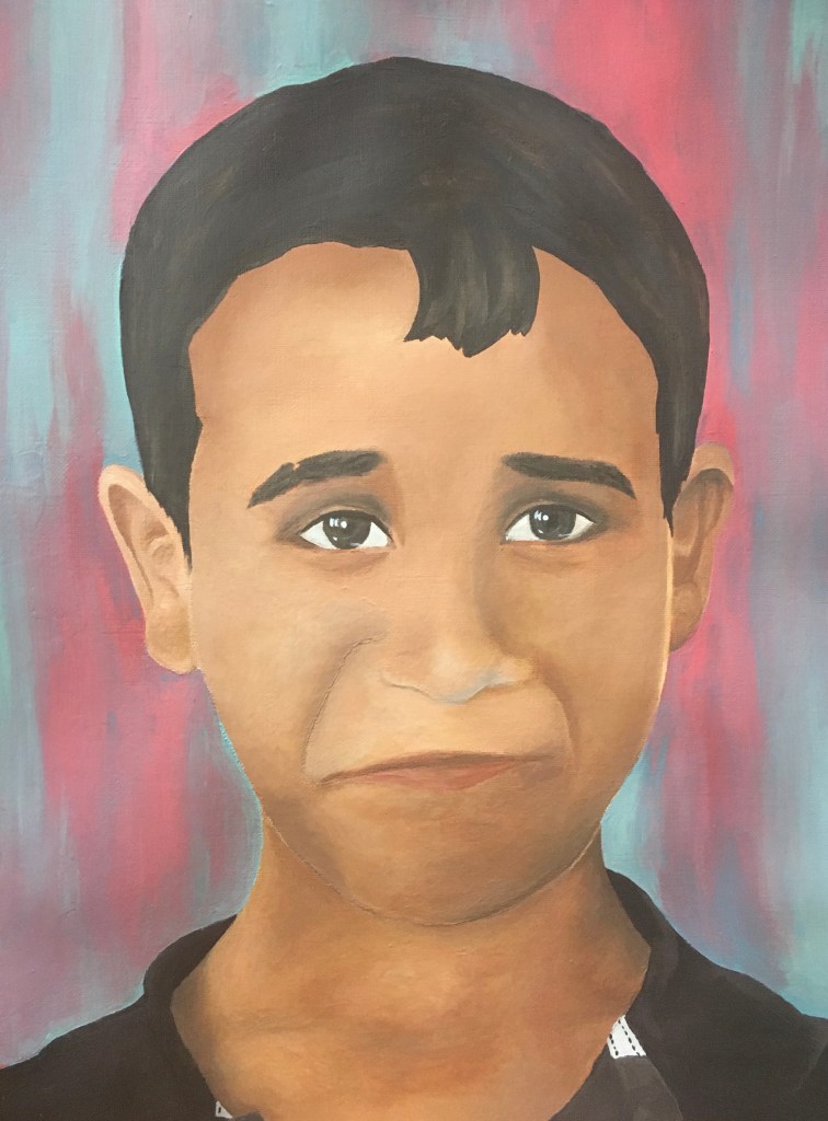 I had the honor of participating in UNICEF’s The Memory Project, where art students create portraits of children caught in vulnerable situations. Being that the portrait would be going back to the child, I aimed for a realistic style, using small and blended brush strokes so that the face was smooth. In the background, I have light red and blue streaks, as the child stated their favorite color was red and I wanted to create an upbeat and whimsical tone.