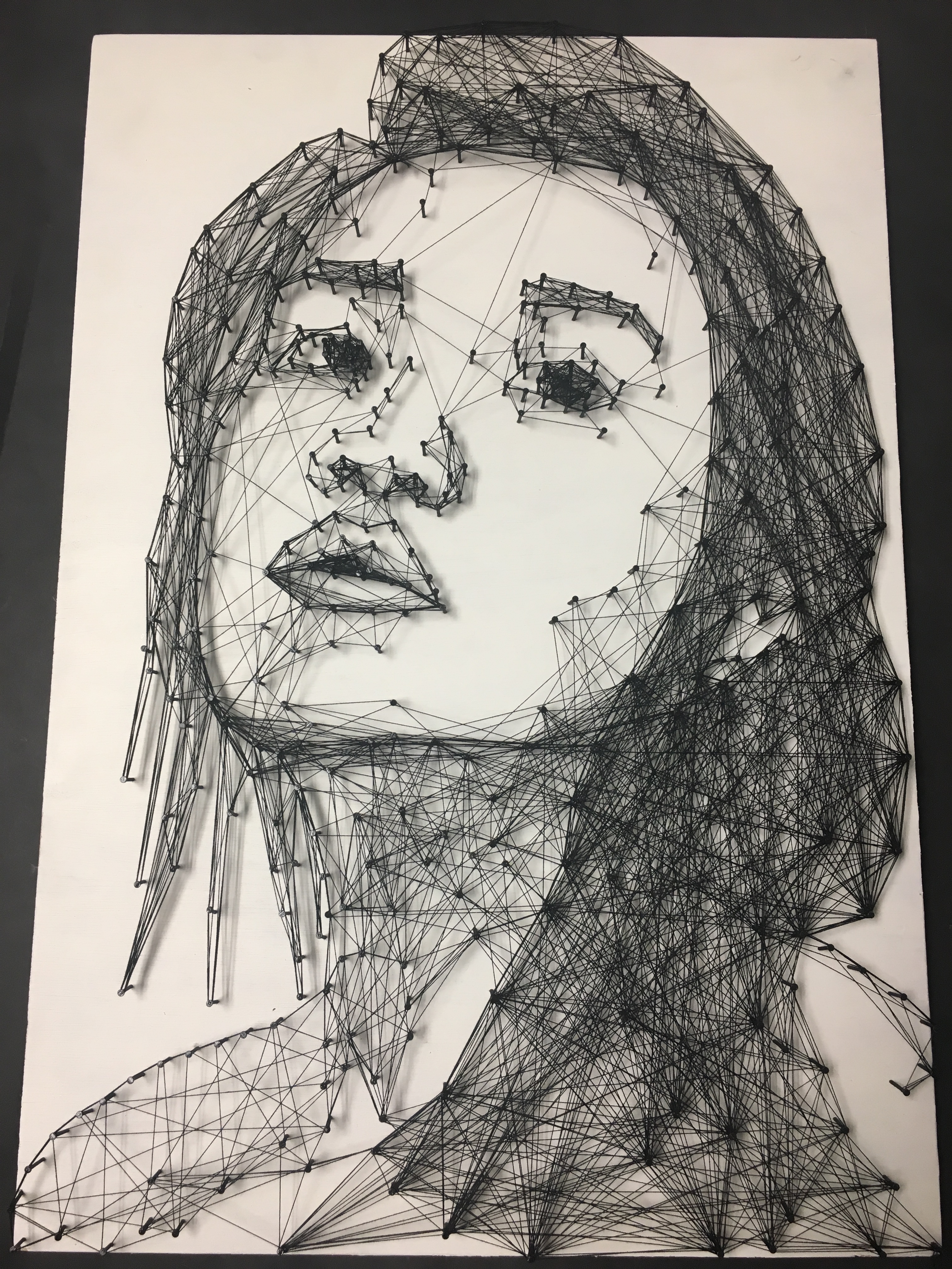 This work is inspired by Debbie Smyth and is a self portrait referenced from a photograph of me looking at myself in a mirror. The theme of this piece is reflection. The simplicity of this work, being made of black thread looped between nails serves to emphasize the relaxed expression of the face. However, the layering of the string allowed me to deconstruct the portrait. This broken down and layered process parallels the process of reflecting upon myself.