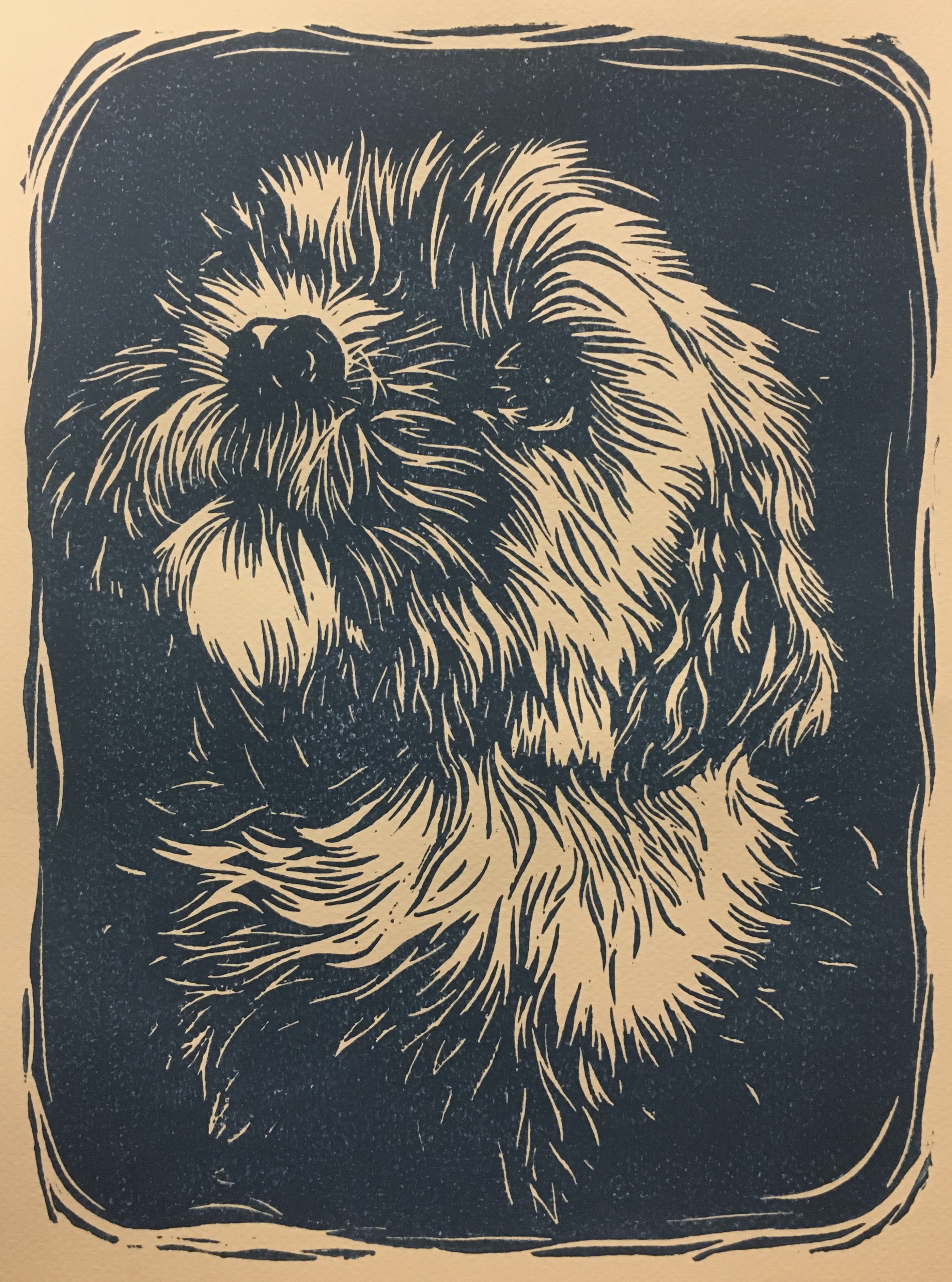 This portrait is one of my dad’s dog. I desired to challenge myself by breaking away from my comfort of human portraiture as well as show my love for dogs. I chose to work on toned paper to create a richer depth in the piece, as the print was only going to be done in a single color. Blue and yellow were chosen as the colors complement one another. Additionally, the color combination is more masculine than feminine, and I aimed to represent Casper in every aspect that I could.