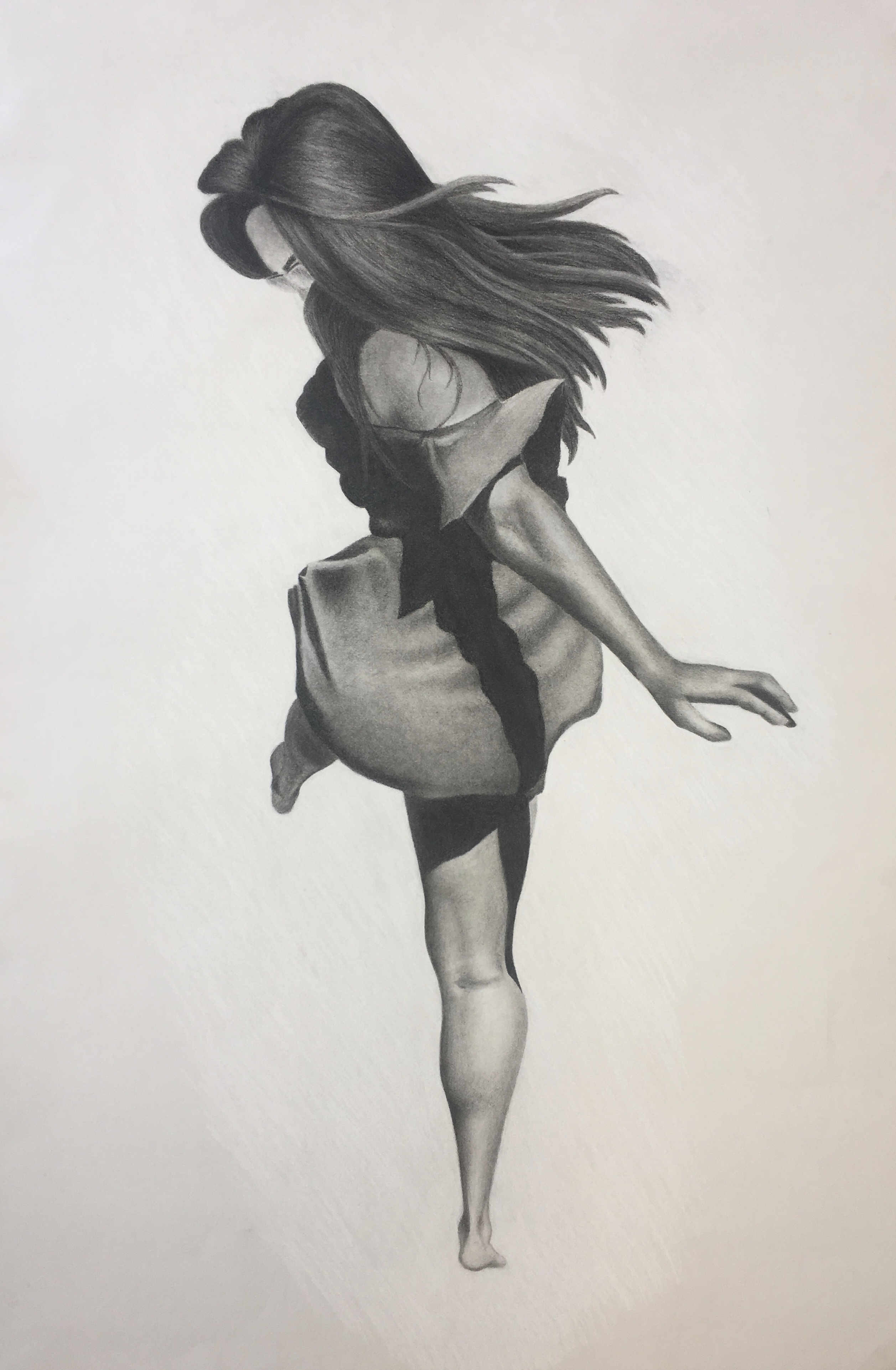 Taking it back to monochrome! Release is inspired by Robert Longo’s Men in the Cities. This piece is meant to represent letting go of tensions and, instead, taking the time to be free with the body and soul. This work was created in grayscale and with a blank, white background to focus attention on the figure and form a moment free of the confines of time.