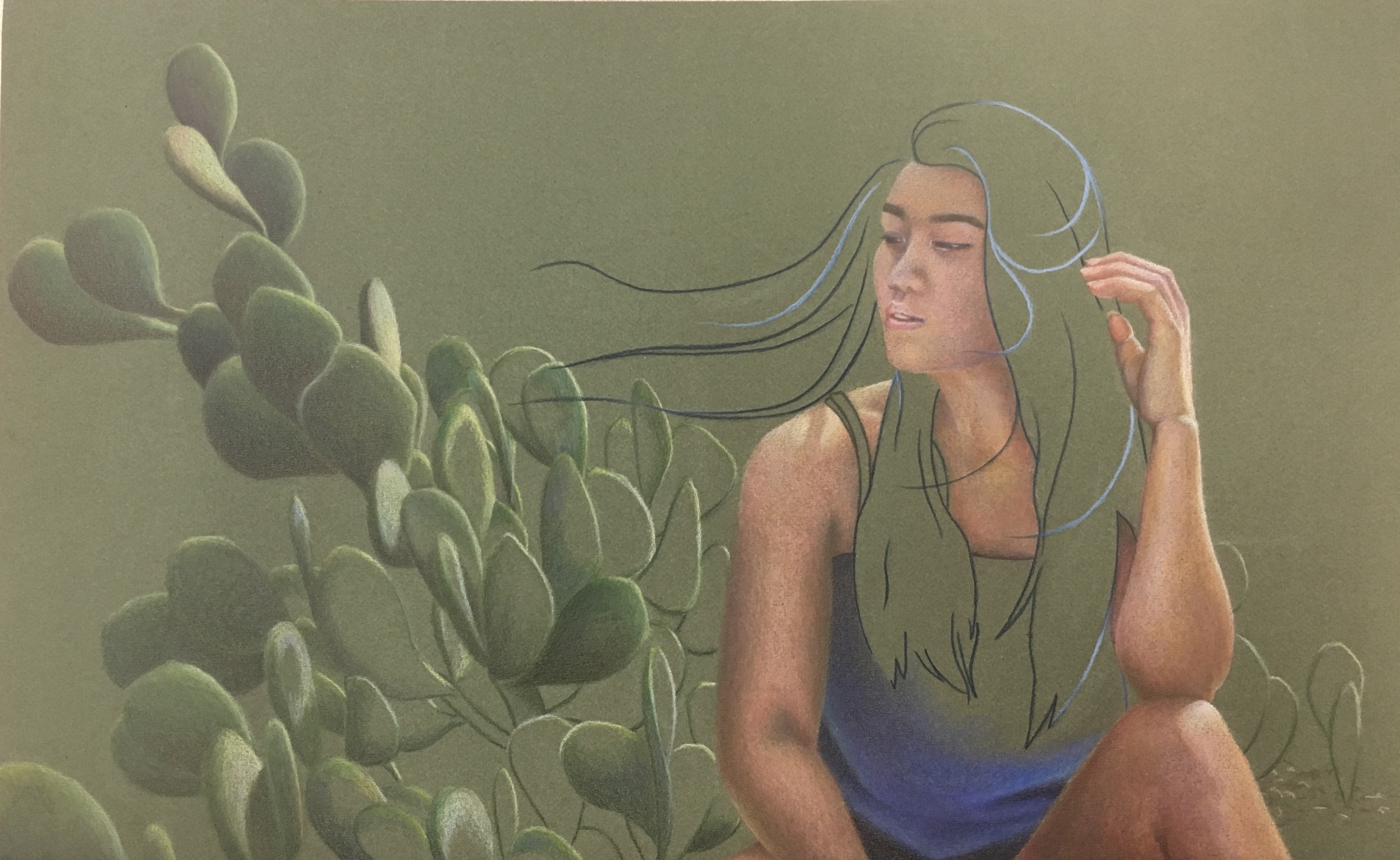 This piece is a self-portrait inspired by Cristina Troufa. Evanesce follows a theme of inner turmoil. The dark hues in the work serve to set a somber tone while the empty spaces in the figure and cacti serve to symbolize the subject “fading into the background,” struggling through feeling insignificant to the world around them.