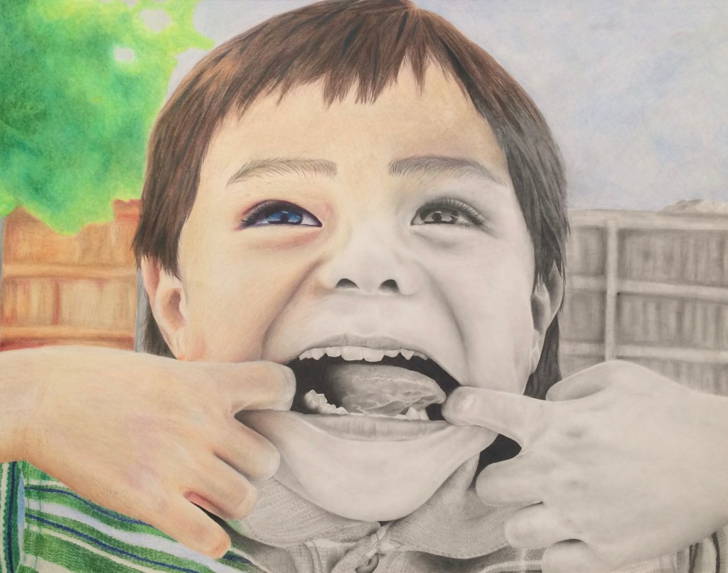 The composition of Goofy Face is a play on a polaroid picture, with the monochrome right half being the developed picture and the colored left half being the live reality. The composition idea came from my lack of art experience at this work’s time of creation. This was my first real effort using colored pencil and I wanted to play the strengths I had developed already in graphite.
