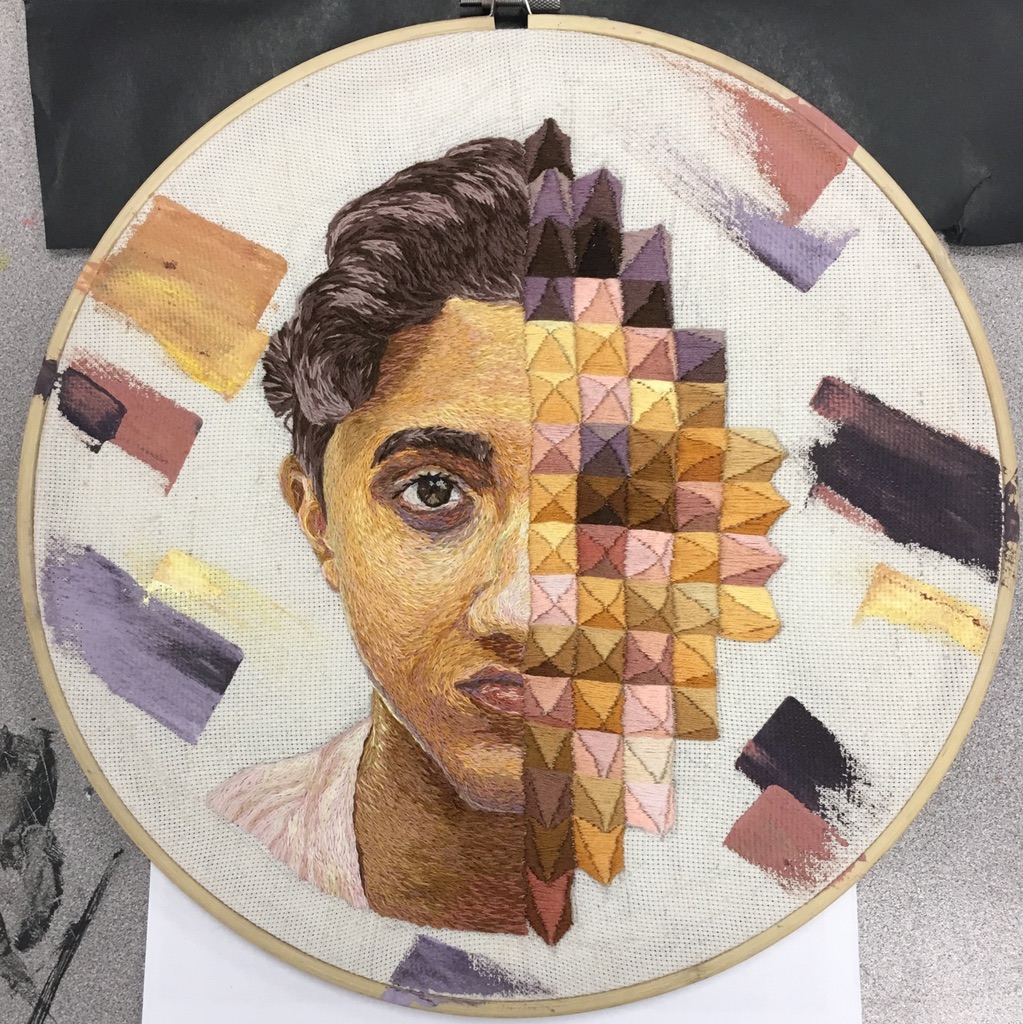 This work was inspired by Davide Cambria and follows the theme of stress. In early high school, I have found myself frequently overwhelmed by both internal and external pressures, resulting in a feeling of “drowning.” The blue background reflects the waves of an ocean, while the abstract and incomplete portrait shows my fight to “break out of the water.”